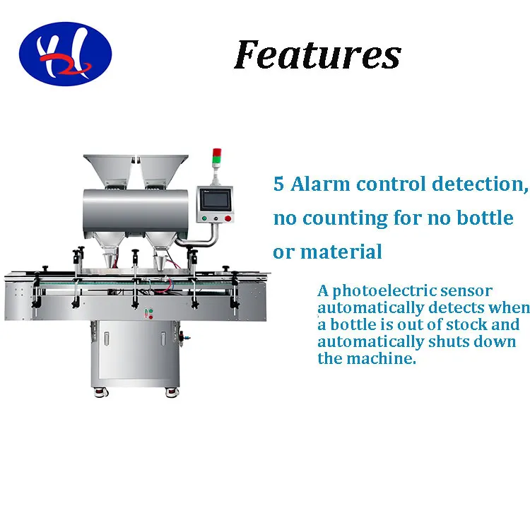The machine features an intelligent detection system; it will automatically pause counting and stop the feeding process if it detects a missing bottle or lack of material.